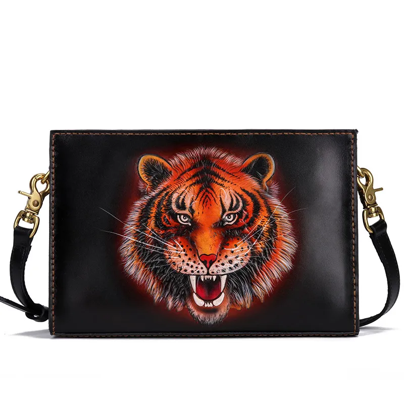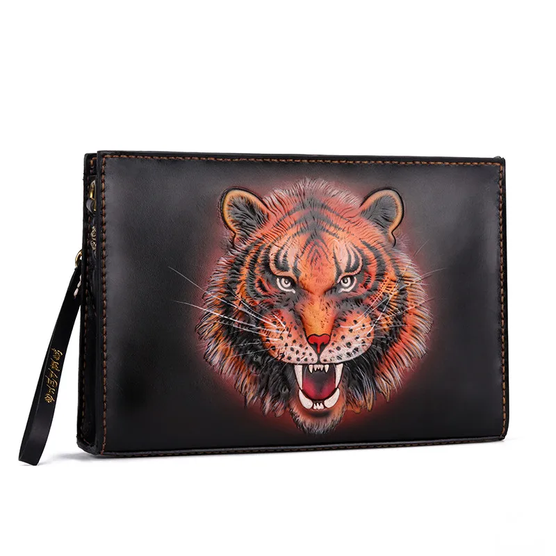 ORIGINAL Handmade Business Men Vegetable Tanned Leather Carving Tiger Bag Money Holder Clutch Purse Phone Po